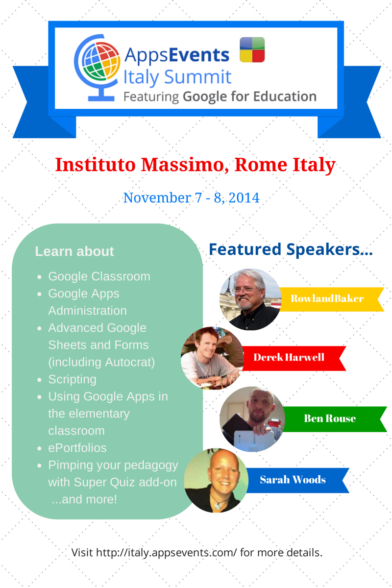 AppsEvents in cooperation with Instituto Massimo brings you the first annual Italy Google in Education Summit happening this November 7 to 8, 2014.